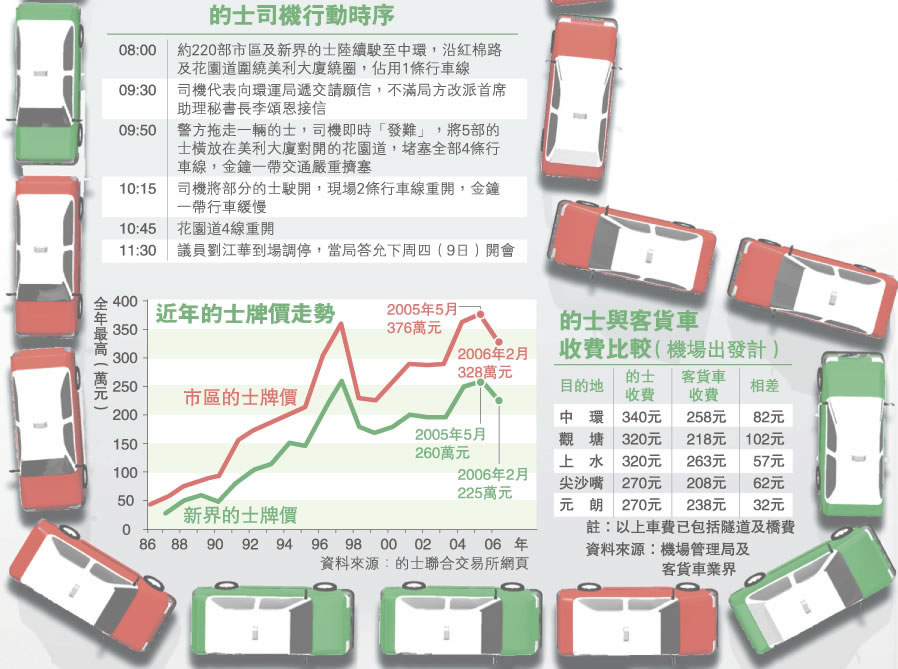 【明報專訊】的士業投訴白牌客貨車搶客,觸發本港經濟命脈的中環區交通擠塞近3小時。200部的士因不滿政府未能打擊非法載客的輕型貨車,昨晨繁忙時間包圍環境運輸及工務局所在的美利大廈,其間數部的士「發難」,堵塞花園道全部4條行車線,令半山區交通陷於癱瘓。
